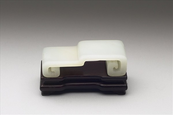 白玉,玉色光潤。全器呈几形,兩端向內捲,板面一高一低,可放置墨錠。附木座。