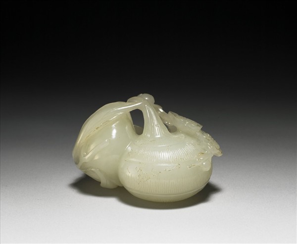 白玉,色泛青,微帶赭斑。全器作荸薺、桃實相連之形,上以梅枝相連,在桃實上並有蝙蝠。置於紫檀木圓盒中。