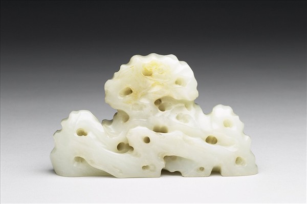 白玉,玉色泛黃,微有赭斑。全器作太湖石,略扁,其上雕有孔洞以顯太湖石的特徵。