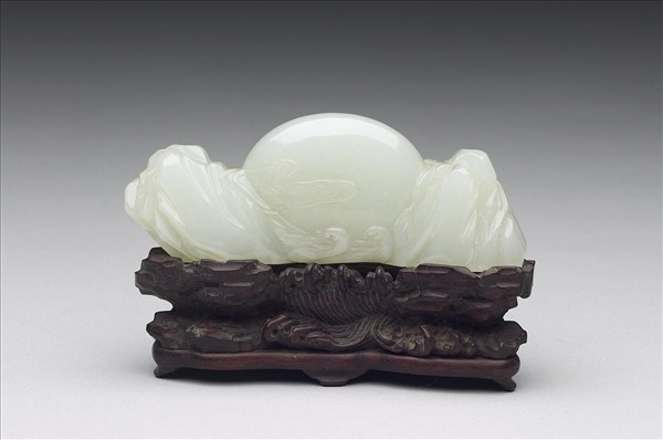 白玉,玉色瑩白。全器略扁,作兩山之間波濤之上升起之旭日,一面雕有雲彩。帶雕刻木座,木座紋飾與筆架連貫一氣,兩端雕做山岩,中央夾有波濤。