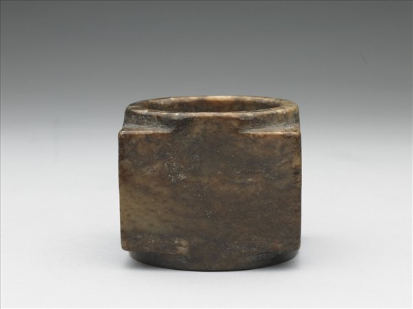 玉色深赭,間以白斑。全器內圓外方,四面平直,上下端有射,射頸略短,頸內圈、外圈圓整口。
