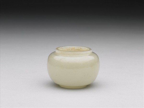 白玉,玉色略泛黃,光潤。直口、豐肩、弧形壁,有圈足。