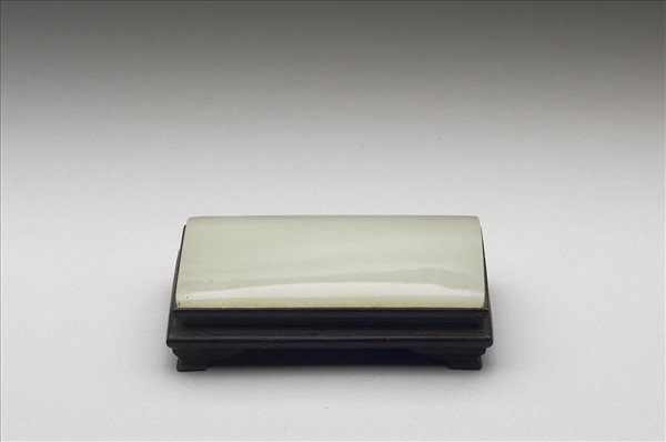 青玉。全器呈片狀長方形,面略為弧形不全然平面,可放置墨錠。附木座。