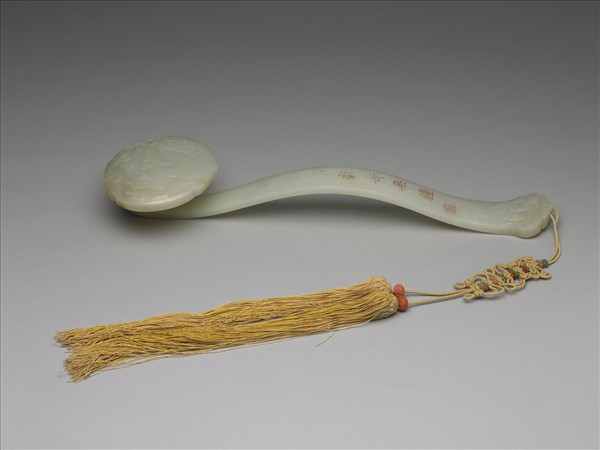 雲葉式首面浮雕壽星駕鶴、群仙祝壽、及蒼松、桃樹、壽山福海等紋式;柄中央隆起,刻楷填朱「億齡永祝壽無疆」七字,鈐篆書陽文「道光宸翰」方印;趾部亦呈雲葉形,浮雕松樹、及二僮子手捧葫蘆等物。柄背上端及趾浮雕祥雲各一朵。趾端繫黃雙穗、壽結、珊瑚珠。