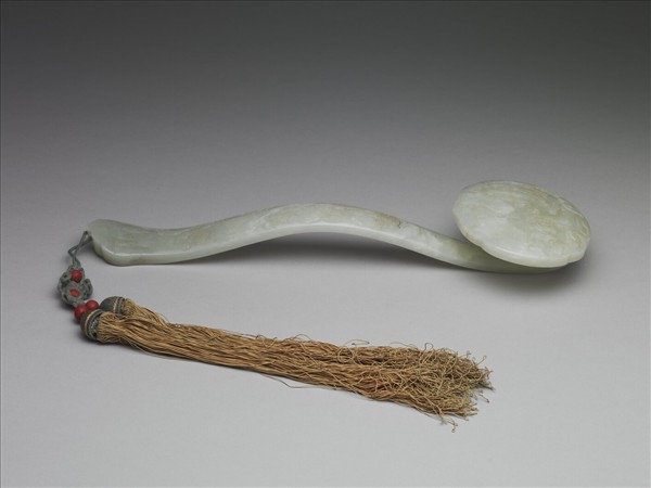 青白玉,如意雲式首,柄中部隆起。全器正面浮雕庭園、山林、樹木及八仙人物,人物兩兩一組,首面刻呂洞賓、漢鍾離,張果老、韓湘子;柄面中央刻鐵枴李、曹國舅,尾部雕藍采和及何仙姑。柄首背面均有凸邊緣線,飾朵雲紋及蝙蝠紋。趾端繫黃雙穗,飾綠色繩結。