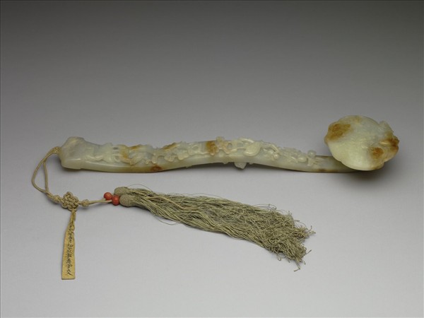 青白玉沁褐,如意雲式首面周邊起棱,頂端雕一鳳,口銜一桃枝,下有一如意裝飾,隙地填飾淺浮雕如意雲紋;柄中部隆起,背面刻一桃樹,枝葉伸展至正面上半部,結滿桃實,有一鶴立於其上;一松樹自趾部之山石向上伸,樹下有一對鹿,雄鹿口銜靈芝立於山石之上,雌鹿跪臥於山石之下。趾端繫雙穗、飾珊瑚珠及結。松、鶴、鹿、桃實、靈芝皆帶有長壽的寓意,本件如意可能是作為壽禮之用。