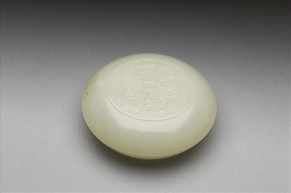 白玉,有白綹,略有黃赭斑。全器為圓形。蓋與器身略相等,蓋頂平、弧形蓋沿、弧形壁,有圈足。蓋頂有弦紋一道,中央有太極,其外圍有幾何式圖案。