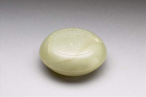 玉色青灰,有白綹與黃赭斑。全器為圓形。蓋與器身略相等,蓋頂平、弧形蓋沿、弧形壁,有圈足。蓋頂飾團「壽」字。