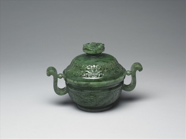 碧玉,玉綠色而有灰斑。有蓋、朝冠耳,圓腹,有圈足。蓋鈕立雕一盤螭,蓋面鏤雕番蓮卷葉,腹部則淺浮雕獸面紋。圈足內陰刻有「乾隆年製」四字隸款。