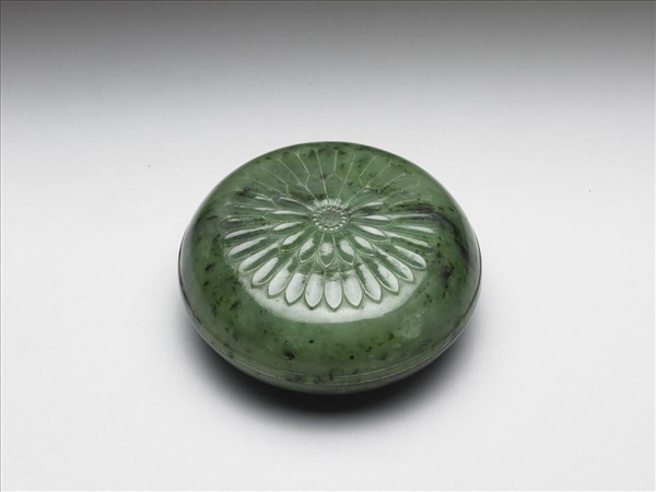 碧玉,玉色綠而有黑斑。全器為圓形。蓋與器身略相等,蓋頂平、弧形蓋沿、弧形壁,有圈足。蓋頂淺浮雕有菊瓣紋。圈足內陰刻有「乾隆年製」四字隸款。