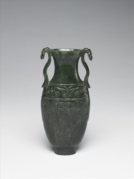 碧玉,玉色深綠,間有黑斑及白斑。全器為扁圓形,口稍外撇,長頸、兩耳、鼓腹,有圈足。兩耳為立雕如意。口沿有回紋,肩部以淺浮雕飾卷雲紋及蝴蝶,腹部為三角形葉紋,內陰刻回紋。
