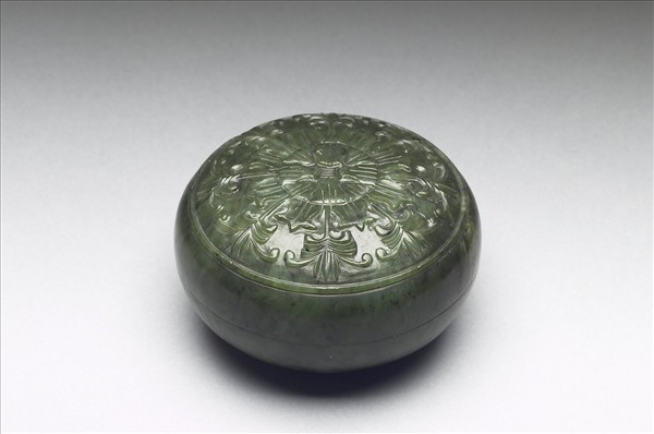 碧玉,玉色深綠,間有黑斑。全器為橢圓形。蓋與器身略相等,蓋頂圓弧、弧形壁,有圈足。蓋頂為幾何花卉紋。