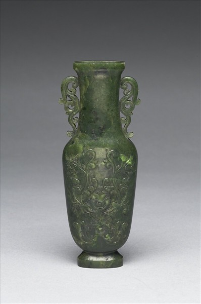 碧玉,玉色深綠,間有黑斑白斑。玉深綠色。全器為扁瓶,長頸、長扁腹、有圈足。兩耳作立雕卷草、腹部以淺浮雕飾伊斯蘭風格卷草花葉。