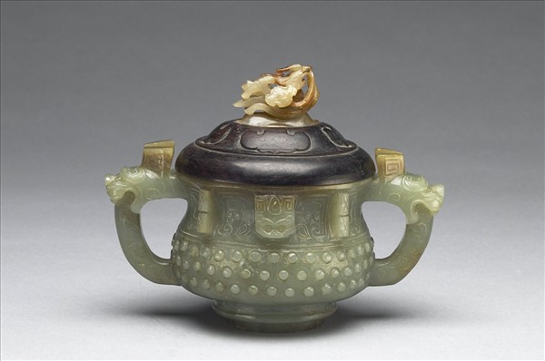 青玉,玉色灰青,局部有赭斑。全器作青銅簋形。撇口、束頸、圓鼓腹、有圈足。兩耳作獸首立雕。頸部有棱脊及簡化獸紋。在口沿處中央飾有高凸小獸首,腹部下方為乳丁紋。附木蓋玉頂,白玉玉頂,玉色泛黃,有大片赭斑,以多層次鏤雕為鴛鴦,口啣荷葉,並有花莖穿插其中。木蓋蓋面則飾以如意雲紋。