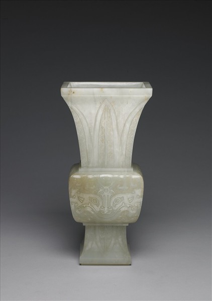 白玉,玉色白,有灰赭色斑。全器作方形,仿自銅器三段式觚形,方鼓腹、有圈足。脰部與圈足有蕉葉紋,腹部則飾獸面紋。