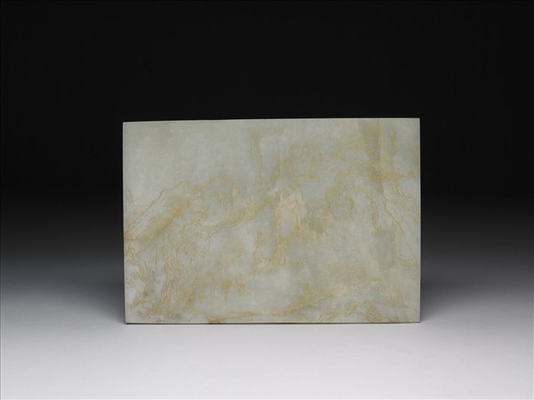 白玉,玉色白而有青斑。全器作片狀長方形。兩面皆陰刻描金畫有山水景象,一面描繪行走於山壁小徑間的乘轎行旅,一面則為寒林山景。