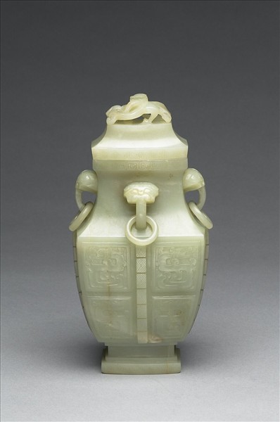青玉,玉色泛黃,有白斑。全器作扁方形,器形仿自銅器尊。有蓋、長頸、折肩、斂腹、有圈足。頸邊有四獸首耳,並帶活環。蓋鈕作立雕小獸。腹部有棱脊並淺浮雕夔龍。圈足內陰刻有「乾隆年製」四字隸書款。