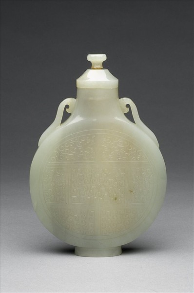 扁腹圓如滿月,頸、肩以倒鉤形雙耳相連,狀似抱月,故名。明、清瓷器常見此形制。腹外壁界成方格,格內飾以繁複之蟠螭紋。此種形式仿自戰國青銅扁壺。