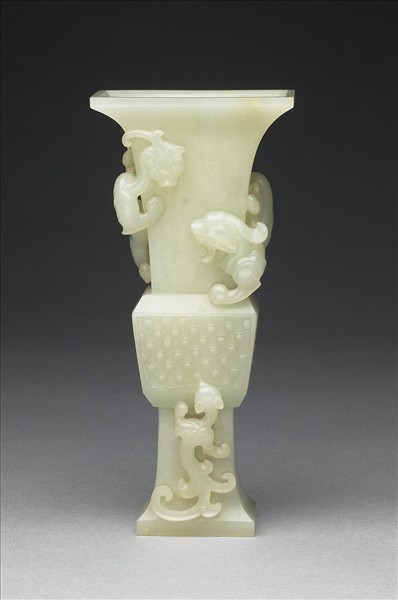 玉局部赭斑,全器呈方形,仿自銅器三段式觚形,脰部外撇,方腹、有圈足。腹部作乳丁紋,脰部有二螭盤繞,另一隻小螭則於圈足處。螭獸以高浮雕表現。