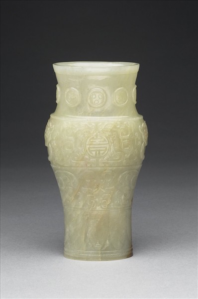 玉色略黃,有璺及赭斑。全器呈扁圓,仿自銅器觶形,寬口稍外撇,豐肩。頸部有圓渦紋,腹部紋飾淺浮雕並分作三層,第一層兩相對夔紋,中央作團「壽」字,器兩側並作獸首啣環紋;第二層為獸面紋及夔紋,最底層則為蕉葉紋。