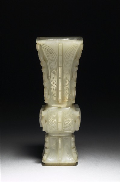 玉色泛黃,有白斑。全器呈方觚形,脰部外撇、方鼓腹、有圈足。全器皆作鏤空棱脊,脰部與圈足有蕉葉紋,腹部則陰刻獸面紋。