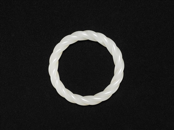 白玉,環形器,質地白淨瑩潤,整器雕作兩股絞絲交繞成器,其雕琢凹凸分明,極力追摹具有彈性的線繩絞繞成環之狀,是該玉鐲雕作上的特色。此器與其他五件玉鐲同儲於一木屜。