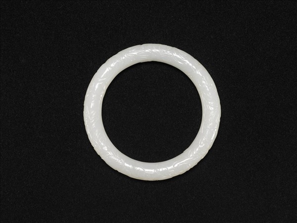 白玉,環形器,質地白淨瑩潤,其上刻細密紋飾。此器與其他五件玉鐲同儲於一木屜。