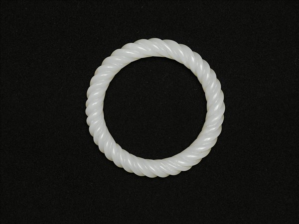 白玉,環形器,質地白淨瑩潤,整器雕作兩股絞絲交繞成器,其雕琢凹凸分明,絞繞甚密,極力追摹具有彈性的線繩絞繞成環之狀,是該玉鐲雕作上的特色。此器與其他五件玉鐲同儲於一木屜。