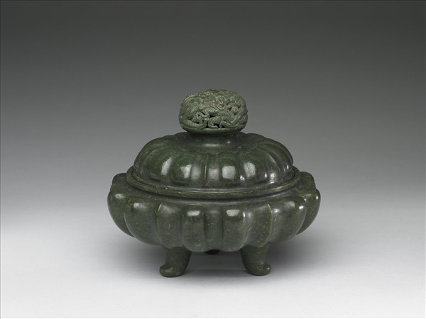 碧玉。附鈕蓋、子母口、鼓腹、三足,腹有凸棱如南瓜之形。蓋亦有凸棱與器腹相若,蓋鈕鏤空雲間盤龍。