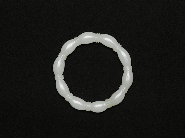 白玉,環形器,質地白淨瑩潤,器上雕飾箍棱,兩股箍棱緊挨為一組,整器共雕飾十組,等距布列於器上。每組箍棱間之區段,皆作中央鼓起而兩端緊束樣貌。此器與其他五件玉鐲同儲於一木屜。