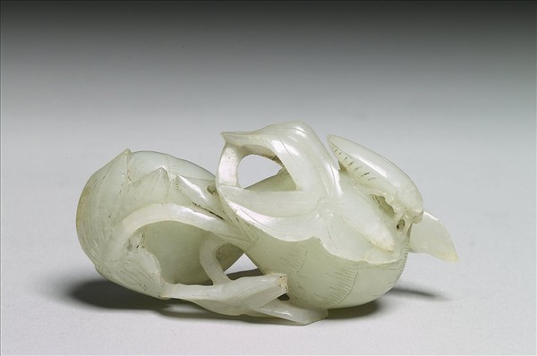 玉質。全器雕琢慈菇一枝,結二球莖,球莖上雕琢一甲蟲,極富田園野趣。