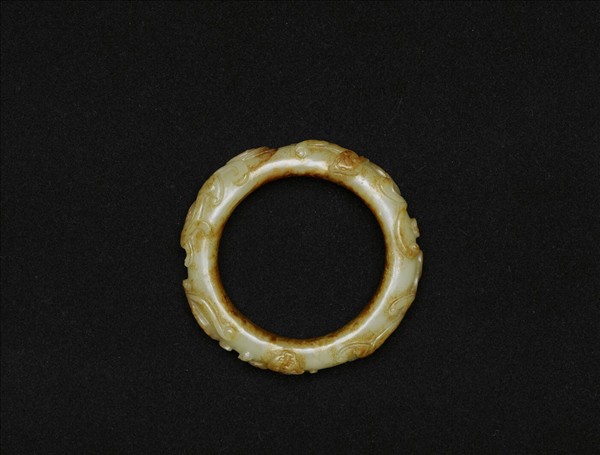 玉環形器,周身遍雜黃斑。器上淺浮雕四螭為飾,螭作攀扶器壁之狀,身首扭動有致,甚有意態。此器與其他五件玉鐲同儲於一木屜。