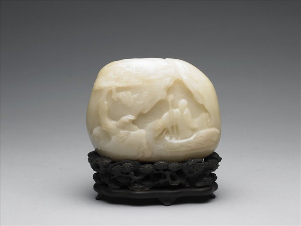 此玉山子為山林間的景致。一面有松樹、蝙蝠及鹿伴著執杖長者,一面有松樹及鶴,富有長壽及福氣的吉祥寓意。附木座。