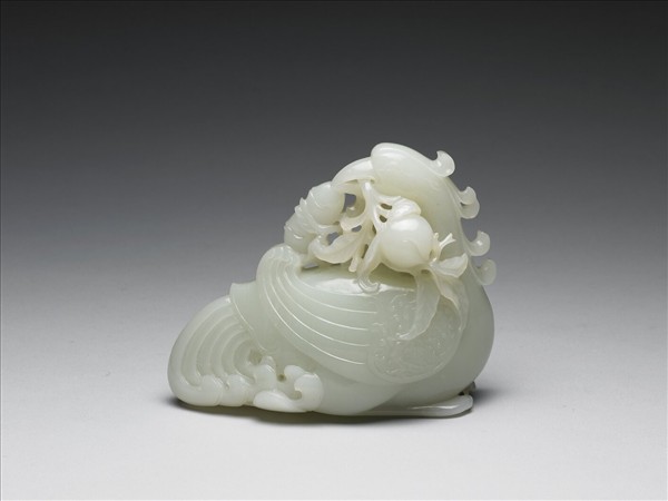 玉質。全器作一回首蹲伏的鳳鳥,口中啣有桃枝。