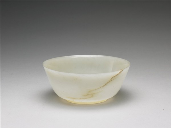 玉質圓碗,素面無紋,有圈足。有數道裂璺。