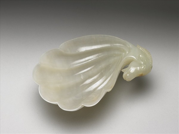 青白玉,局部淺褐斑。琢一羊頭瓜瓣杯。羊的頸部在外壁上形成連續三角形刻邊,在內壁上形成四層階梯式的尖狀結合點。這些生硬突兀的線條,都非真正蒙兀兒瓜瓣杯上所曾出現。器底的生硬平展花,更是模仿伊斯蘭玉器的,可見新疆回部的玉工並不瞭解他們所見過的伊斯蘭玉器,有不同的來源。