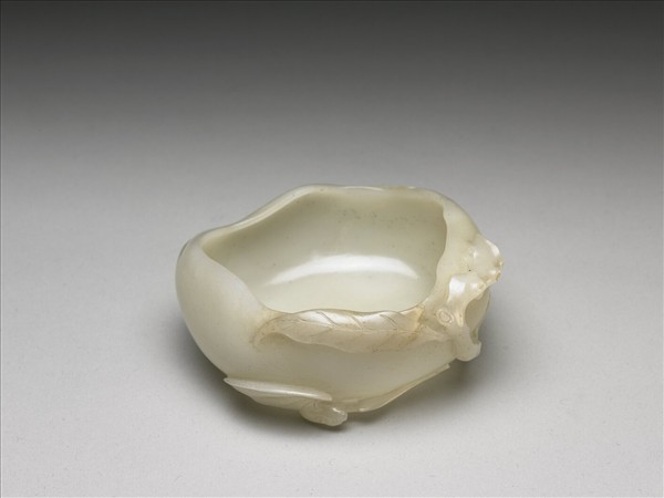 玉質,玉色溫潤,部分帶淺褐色斑及瑕紋。器作剖半桃實一枚,桃實挖空為洗,器外鏤雕小枝葉,器底有一蝙蝠。