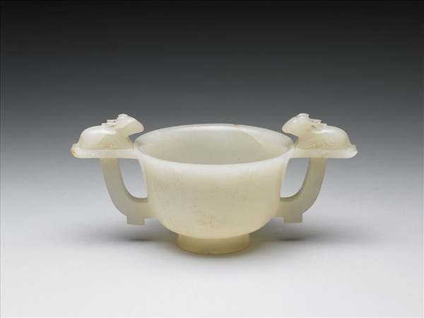 玉質,有璺。圓口、雙耳、圈足。耳上有臥鹿,耳下有小珥。