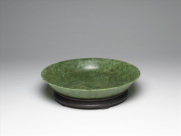 玉質,碧綠色,有黑色及深綠色斑點。器作圓盤,侈口淺壁,整體光素無紋。附木座。