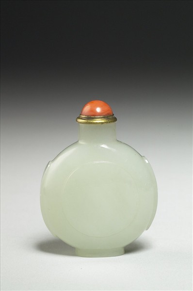 扁圓形,圈足,帶銅蓋珊瑚頂。正反兩面各雕平素圓形開光;左右兩側雕中凹光素橢圓形開光。此為一組二十五件白玉煙壺的其中一件。
