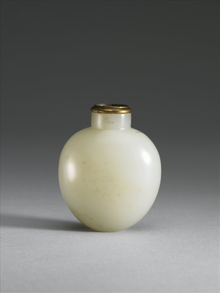 橢圓形鼻煙壺,無紋飾,帶銅蓋,象牙匙。牙匙用以舀出鼻煙,或盛在小碟上,或直接放在拇指背上,入鼻嗅用。此為一組二十五件白玉煙壺的其中一件。