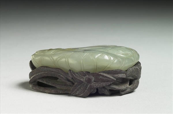 青玉,玉質瑩潤有瑕。器琢兩隻首尾相偎的鯰魚,臥在帶梗荷葉之上。荷葉象徵蓮花與鯰魚一起的組合,取其紋飾及諧音,寓意「連年有餘」。附木座。