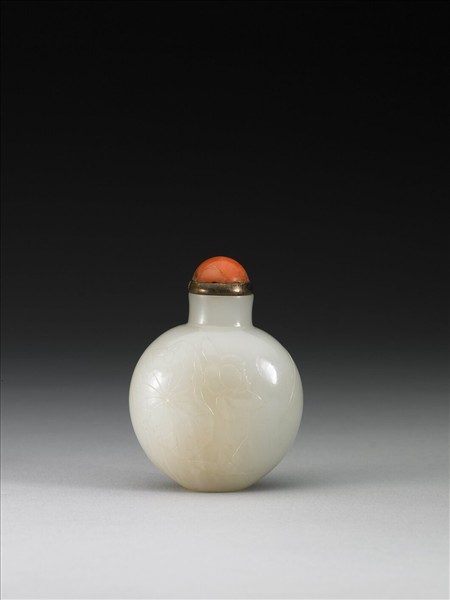 白玉,帶赭色沁斑。圓形鼻煙壺,浮雕蓮花荷葉,水鳥穿梭其中。帶銅蓋珊瑚頂,象牙匙。牙匙用以舀出鼻煙,或盛在小碟上,或直接放在拇指背上,入鼻嗅用。此為一組九件白玉煙壺的其中一件。