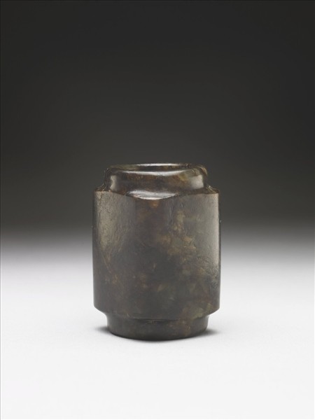內圓外方的筒形,穿孔上下端有圓形短射口。射口經後世磨改。全器無紋,經沁染成深褐色。