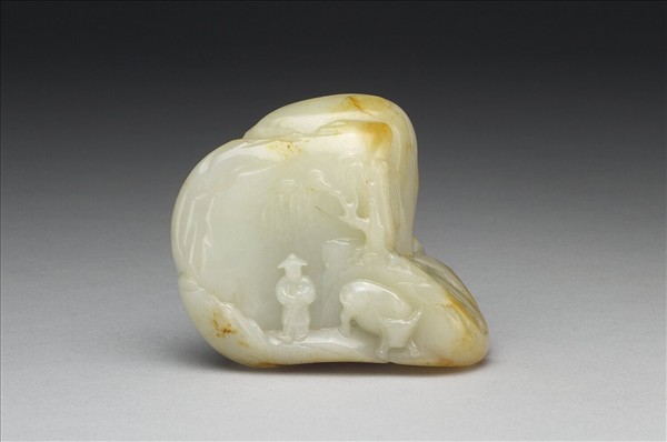 前方立雕童子放牛,背景淺浮雕山水樹石。附鏤空雕花木座一只。
