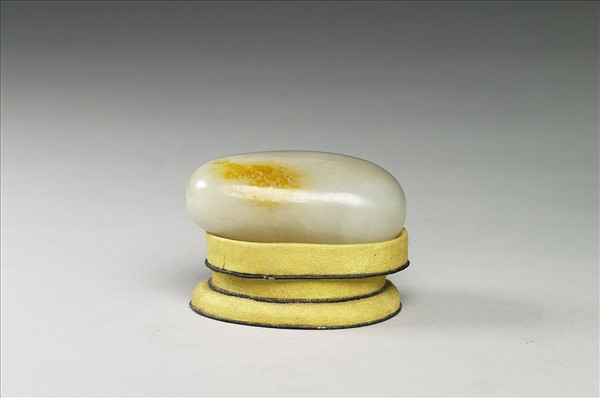 天然石子形狀鼻煙壺。白玉表面有人工沁染褐黃斑紋。此為一組五件白玉煙壺的其中一件。附座。