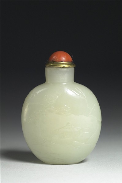 玉質瑩潤無瑕。橢圓形鼻煙壺。器面淺浮雕風景人物場景,一面雕琢松樹、亭閣,一面雕琢扁舟,一漁夫撐篙渡河。帶銅頂珊瑚蓋,象牙匙。此為一組七件白玉煙壺的其中一件。