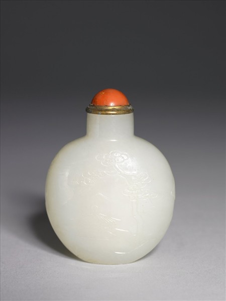白玉瑩潤無瑕。橢圓形鼻煙壺。外壁淺浮雕山水人物圖,亭閣、老松,一老翁拄杖步行。帶銅頂珊瑚蓋,象牙匙。此為一組七件白玉煙壺的其中一件。