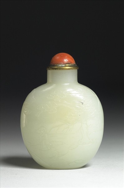 橢圓形鼻煙壺。外壁淺浮雕山水人物圖,有亭閣、木橋,一老翁拄杖步行。帶銅頂珊瑚蓋,象牙匙。此為一組七件白玉煙壺的其中一件。