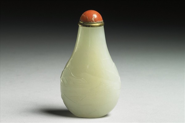 玉質瑩潤帶瑕。匏瓜形鼻煙壺。外壁淺浮雕山水人物圖,一面刻亭閣山水,一面琢老翁佇足岸邊。帶銅頂珊瑚蓋。此為一組七件白玉煙壺的其中一件。